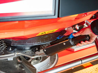 Eine Praktikeridee schafft es zur Serienreife. Mit dem am Streuer vorhandenen Montierwerkzeug werden mit einer Vierteldrehung die drei Befestigungspunkte des Schmutzfängers schnell und unkompliziert gelöst. So ist der Weg frei, die Maschine schnell und sorgfältig zu reinigen.