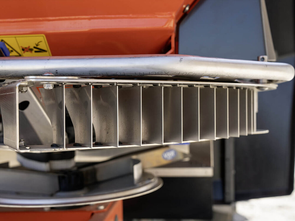 Ein weiterer großer Vorteil davon ist, dass der Schlupf der Traktorreifen bei feuchten Bedingungen oder Hanglagen keine Rolle spielt und das Streuergebnis nicht negativ beeinflusst.